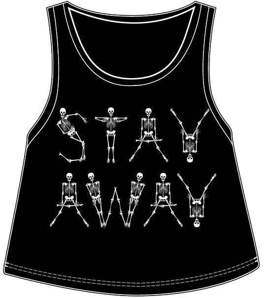 Black gal’s sizing racerback tank in a relaxed fit and slightly cropped length, with white “STAY AWAY” message made up of skeleton letters screenprinted on the front