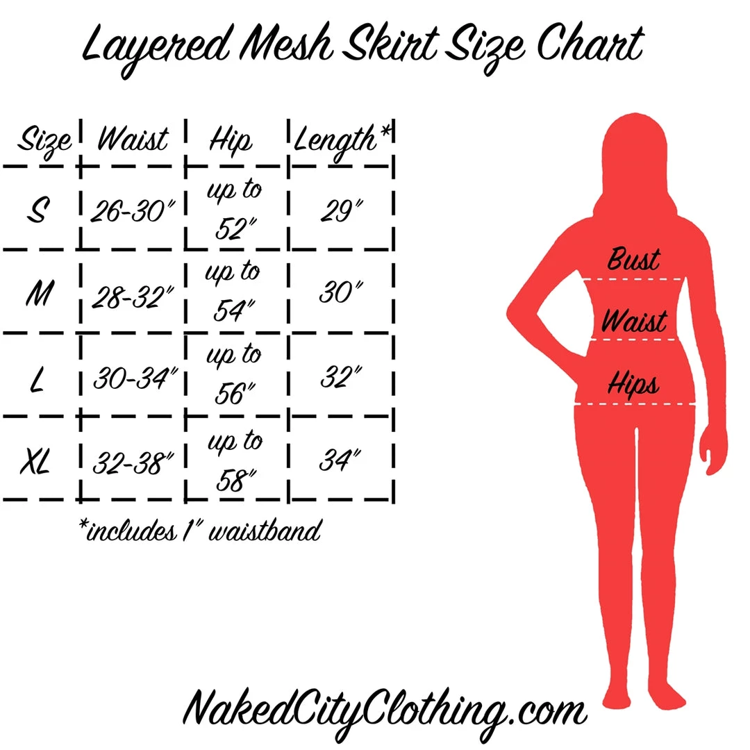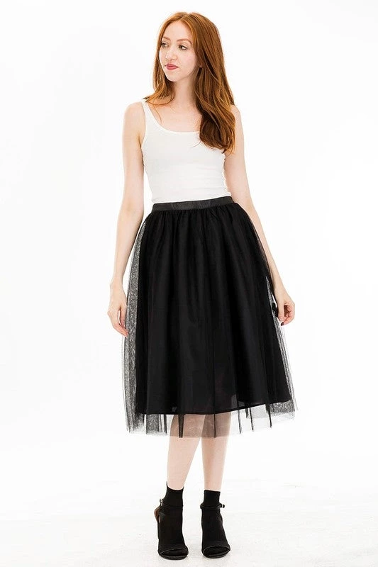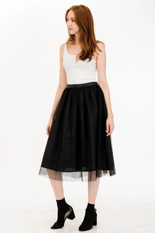 Gathered black knee length skirt with top layer of black tulle –perfect for parties, or cute with a fuzzy sweater and boots