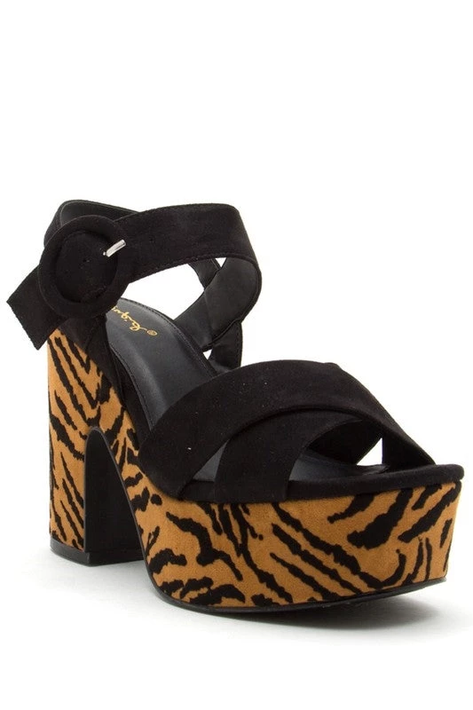 Faux suede platform sandal in black with textured tan & black tiger print –a fierce statement shoe to slip on this summer and make just about any outfit better! Heel height is 4 1/2″ with 1 3/4″ platform, so you’re not canted too far forward –making it a pretty “walkable” shoe.