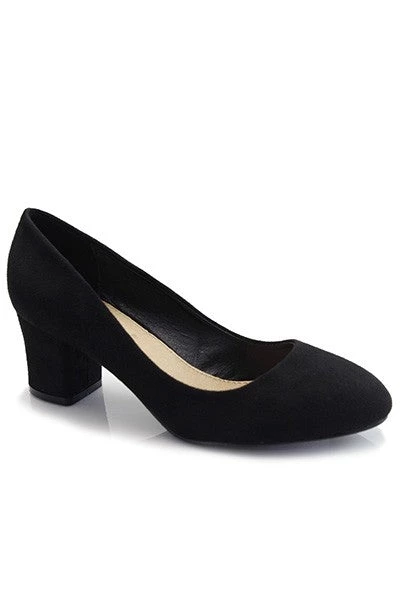 This sweet black faux suede block heel pump has a simple versatile shape that works well with modern and retro silhouettes.