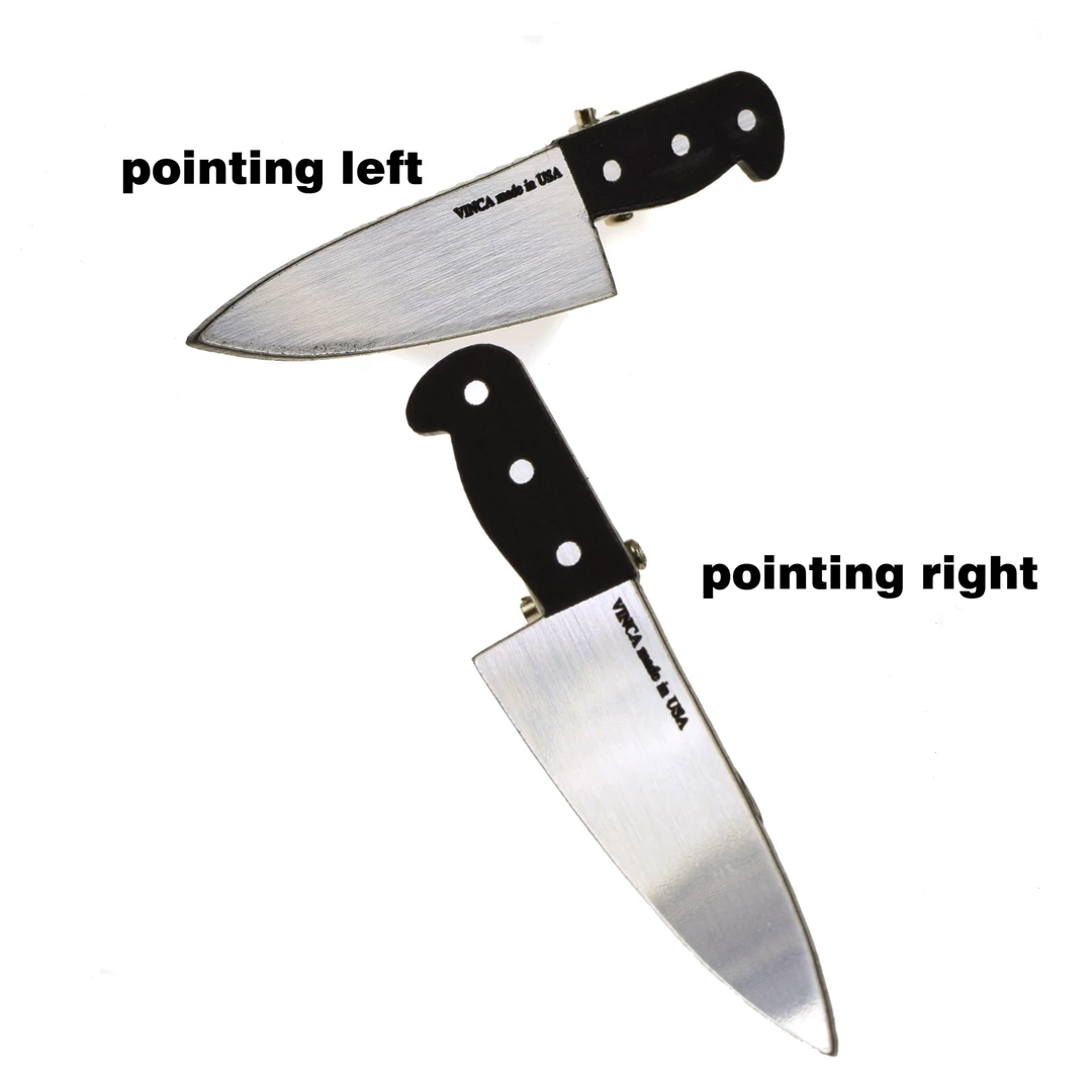 So stabby! Lightweight black and metallic silver acrylic Chef’s Knife on sturdy 1 3/8″ gator hair clip. Available pointing left or right. Made in the U.S.A. by Vinca.
