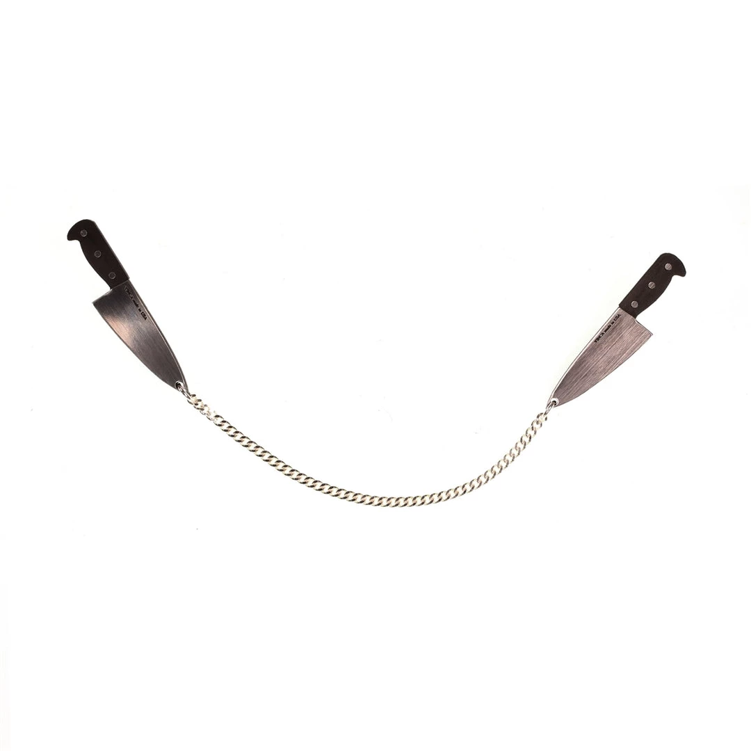 So stabby! Tiny Chef’s Knife black and metallic silver acrylic collar clips linked by 4 1/4″ silver metal chain. These will of course be great on a cardigan too, or just worn as a “scatter” set. Made in the U.S.A. by Vinca.
