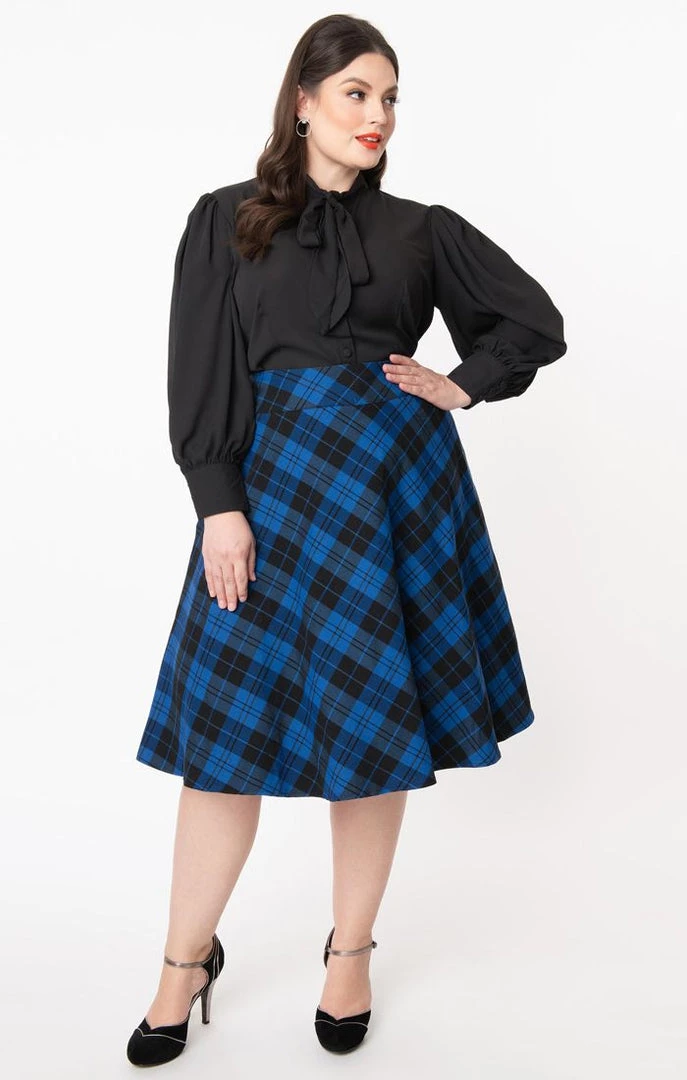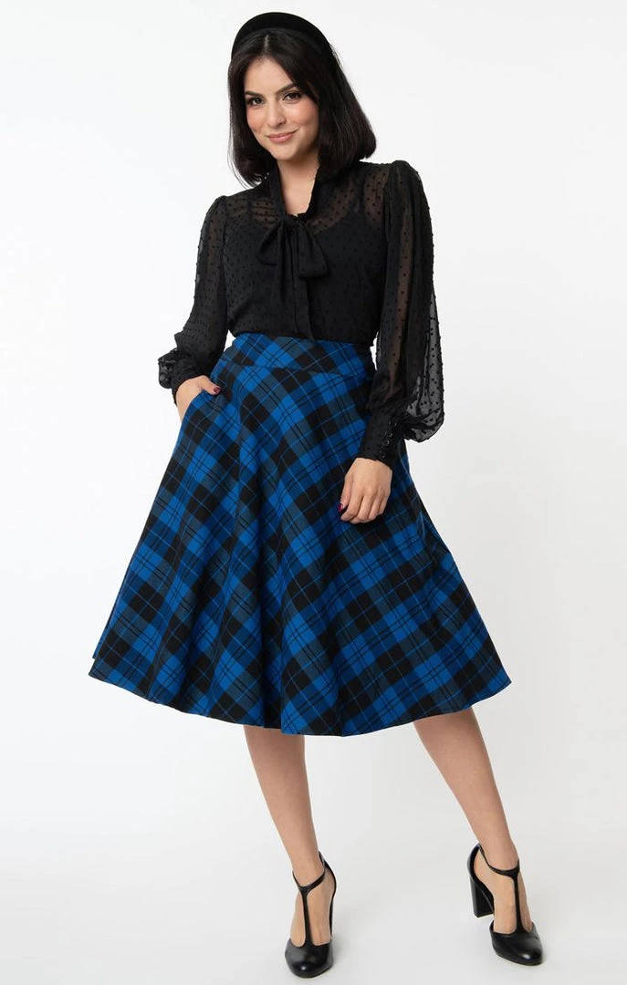Perfectly pretty in plaid! The 50s style Vivien Swing Skirt from Unique Vintage in royal blue & black plaid features a wide waist band with twin metal hook closure, back zipper, side seam pockets, and a flattering just below the knee length.