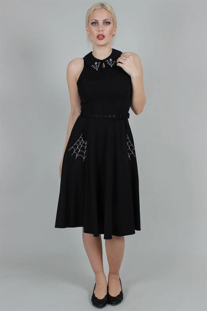 The black with white spiderweb embroidery sleeveless Charlie Flare Dress from Voodoo Vixen features a high neckline with pointed collar and keyhole opening, princess-seamed fitted bodice, self belt, and graceful flared below the knee length –with pockets!