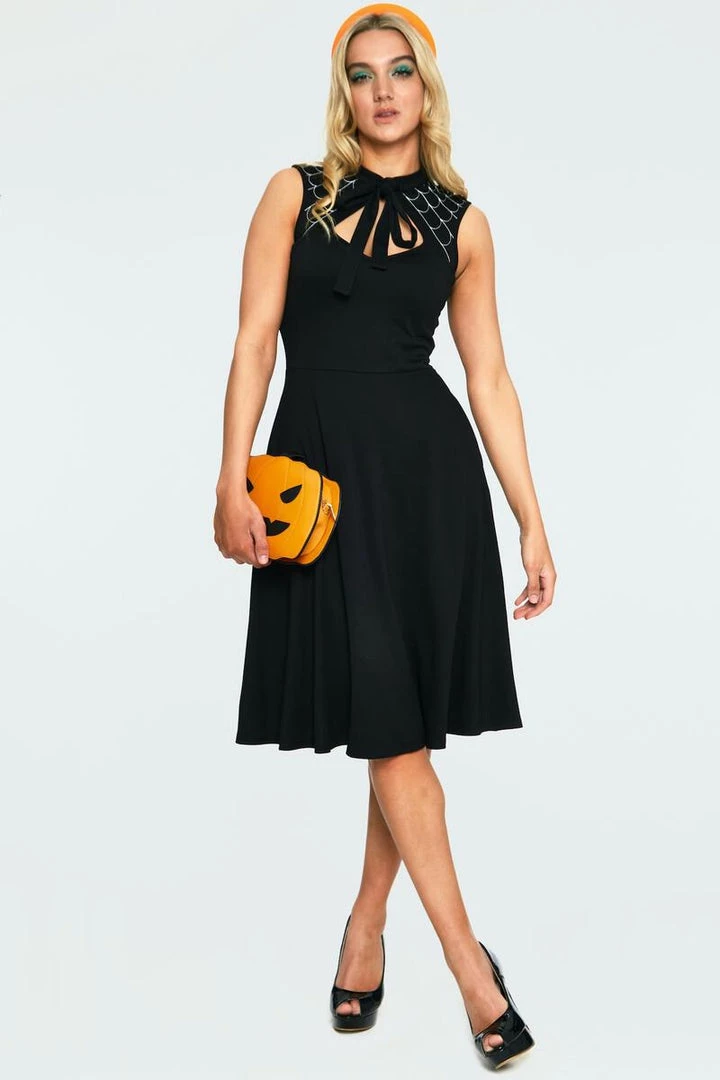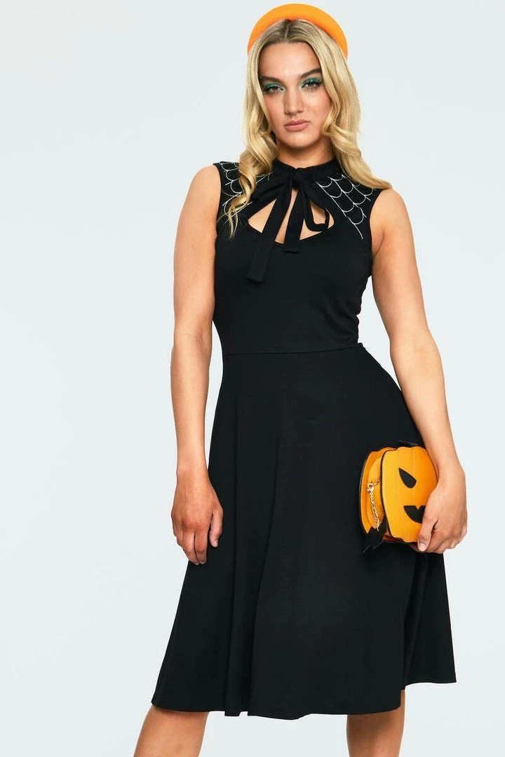 The black with white spiderweb embroidery sleeveless Tie-neck Flare Dress from Voodoo Vixen features a high neckline with double hook & eye/self tie closure and peek-a-boo opening, fitted bodice, and graceful flared below the knee length –with pockets!