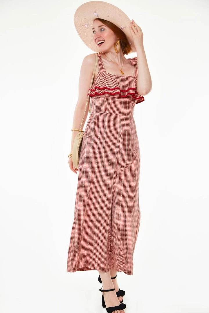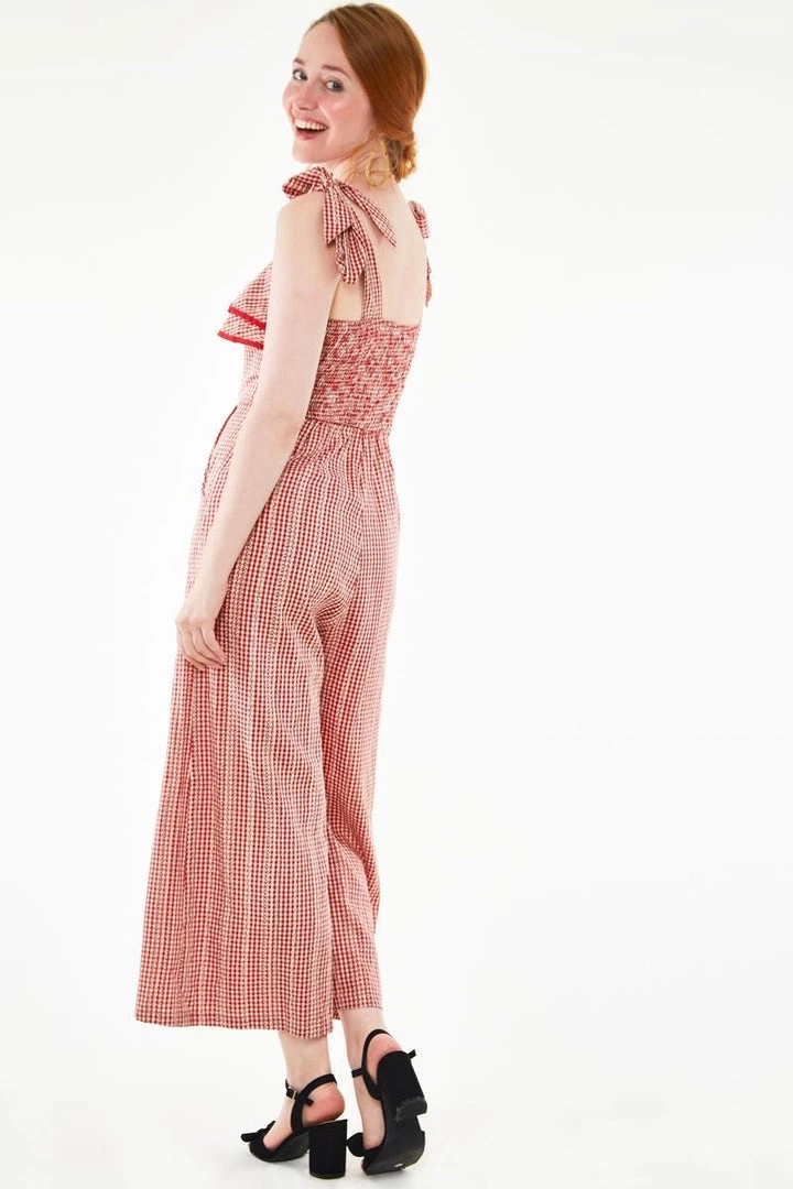 Katrina deep red & cream gingham jumpsuit from Voodoo Vixen features wide adjustable tie straps, square neckline bodice with deep red trimmed double ruffle at the bust, shirred elasticized back, wide slightly cropped leg, and pockets! –a great retro look that’s perfect for sunny summertime days!