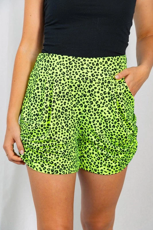 Stretchy buttery-soft brushed fiber knit relaxed fit high waist shorts with elastic waist band, pleated front, ruched side seam detail, and pockets –super comfy, in a bright neon yellow leopard print that’s ready to style with casual tees or sassy cropped tops!