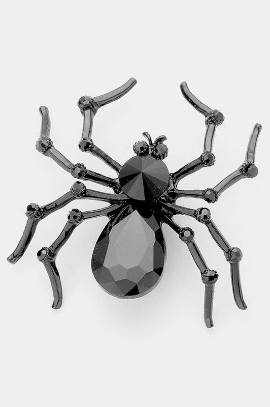 Shiny black jewel and black enameled metal spider-shaped brooch –creepy-crawly AND fancy, yay!