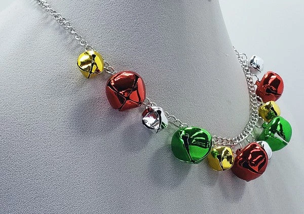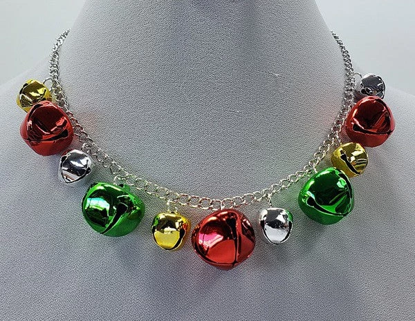 Multi-color varying size jungle bells on shiny silver metal 19″ chain with lobster claw clasp and 3″ extender –very festive and fun to wear!
