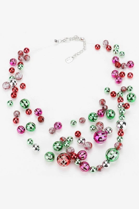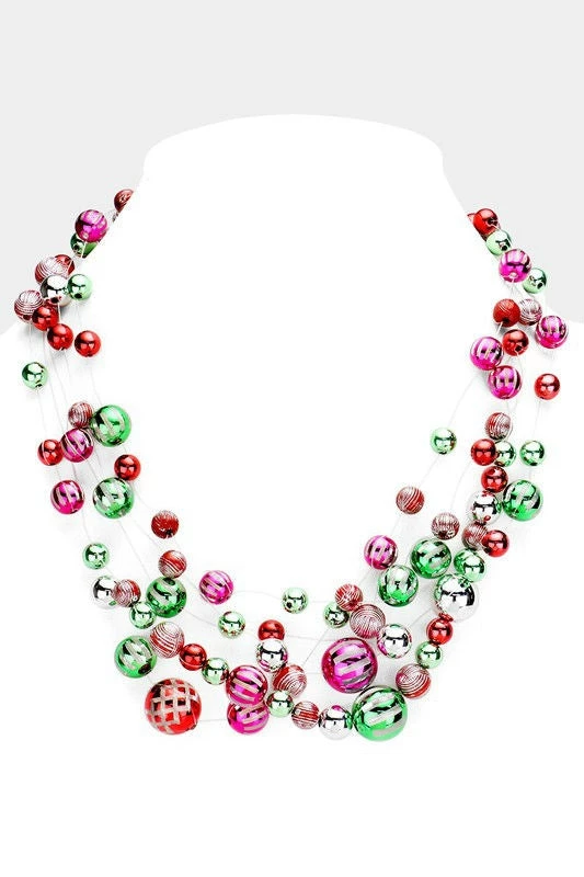 Multi-strand necklace of metallic solid and decorated clear lucite beads that look just like vintage holiday ornaments, strung on clear filament for a light and airy effect –very festive and fun to wear!