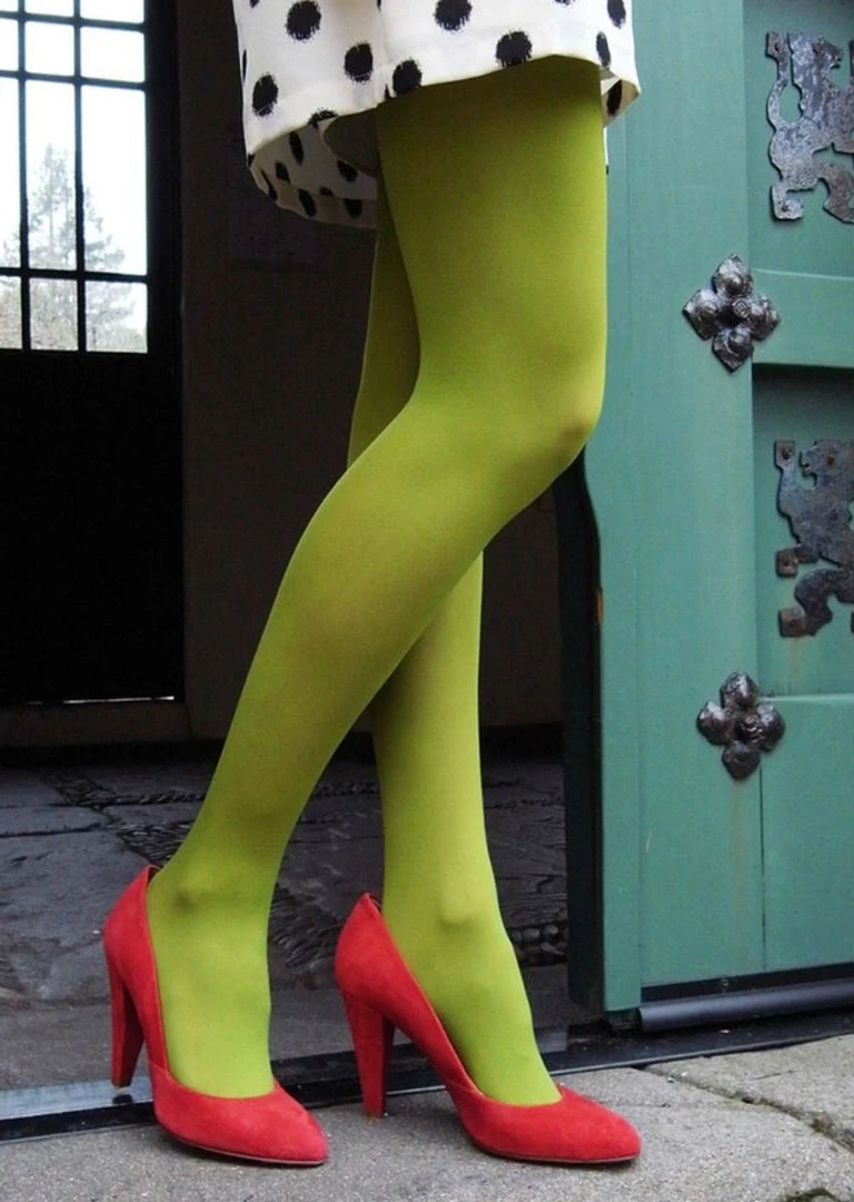 Very nice 80 denier matte finish “Zokki” opaque tights in bright pear green by Tabbisocks. These cozy tights have excellent color saturation even when stretched, a comfortable waistband and great elasticity for a second skin fit.