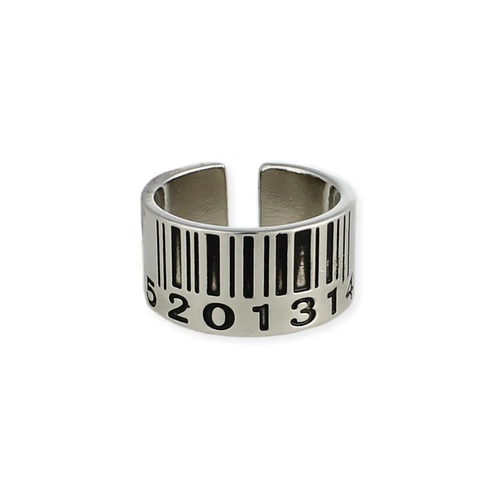 A shiny silver metal ring with a (non-scannable) barcode design etched onto the outside! For shopping fans and futuristic cybergoths alike!