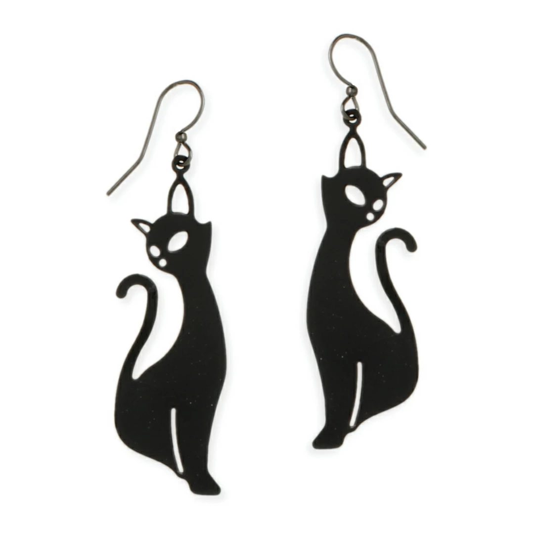 So cute! Black enameled metal sassy 60s retro style long-necked black cats dangle earrings