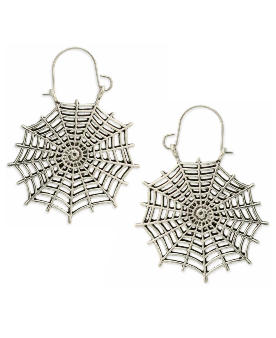 Intricate silver metal spiderweb hoop earrings –an excellent everyday accessory for the Halloween-all-the-time enthusiast!